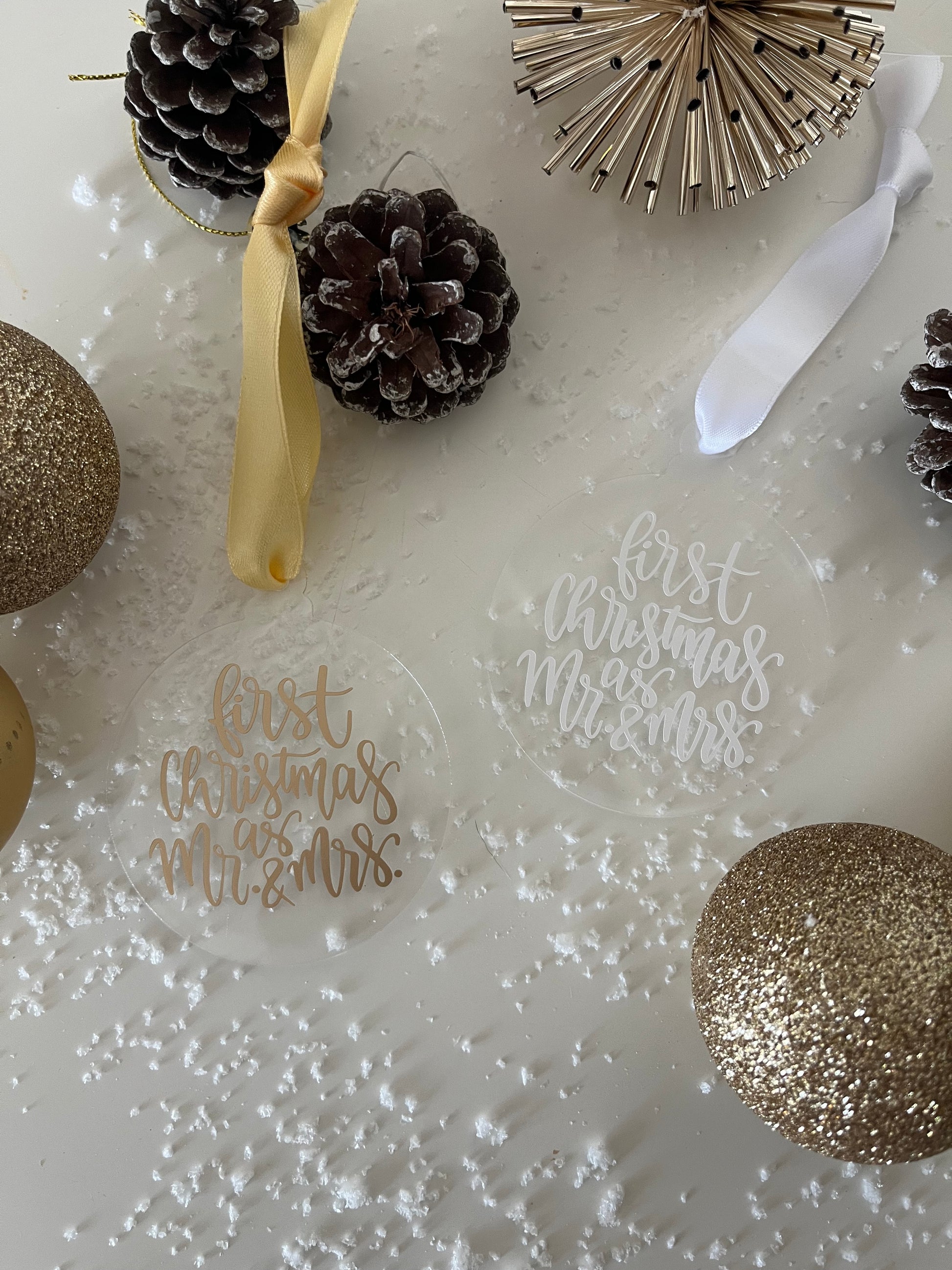 Each ornament is crafted from high-quality clear acrylic with a sleek flat finish, making it a timeless piece to hang on your tree or gift to a newlywed couple.